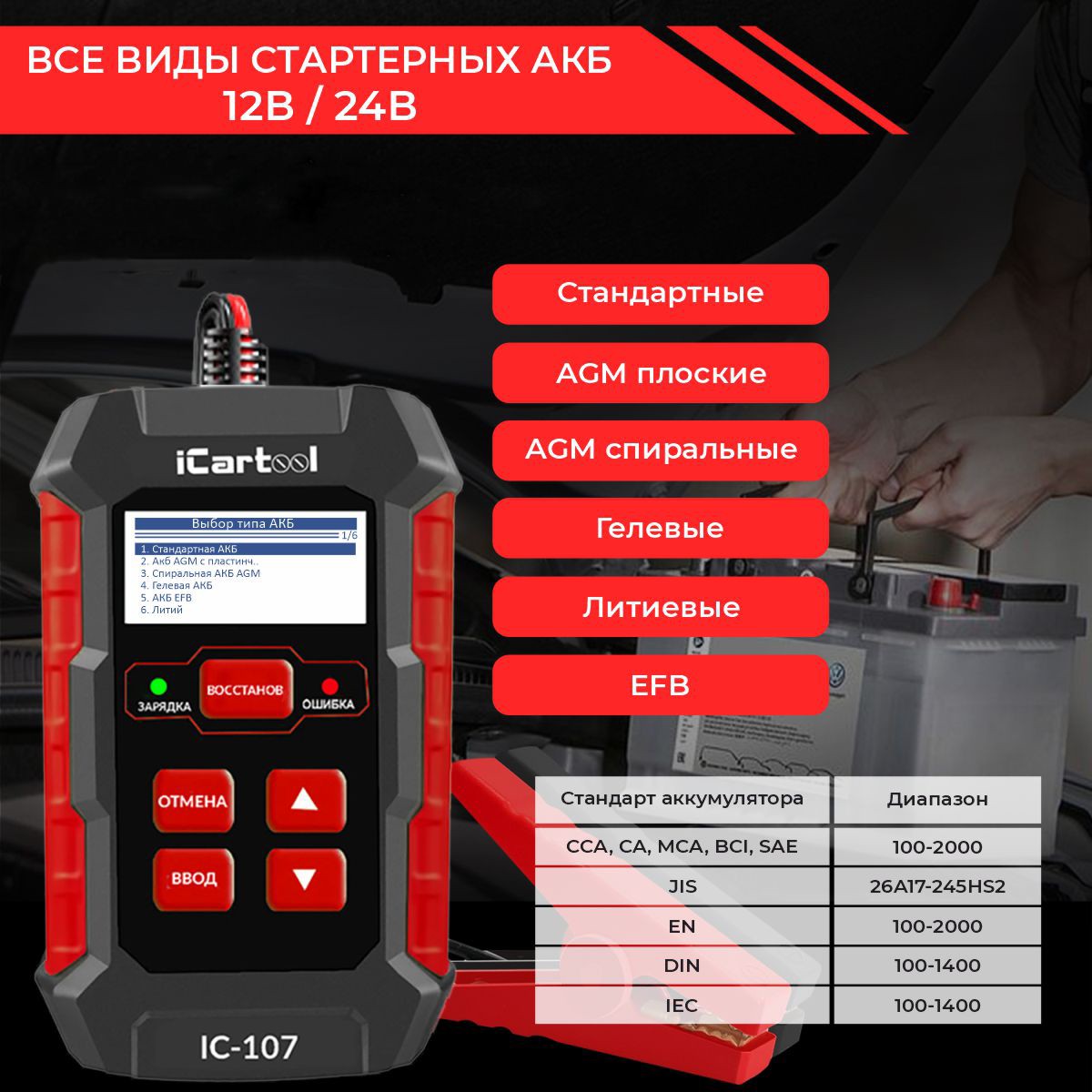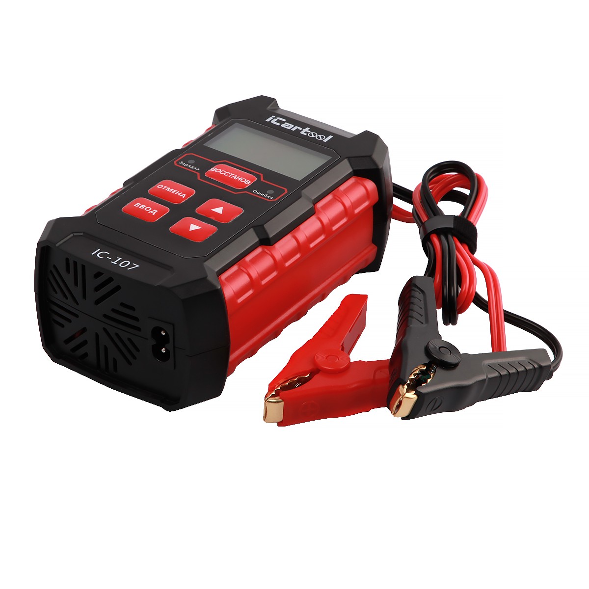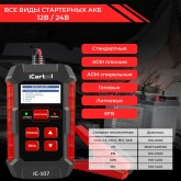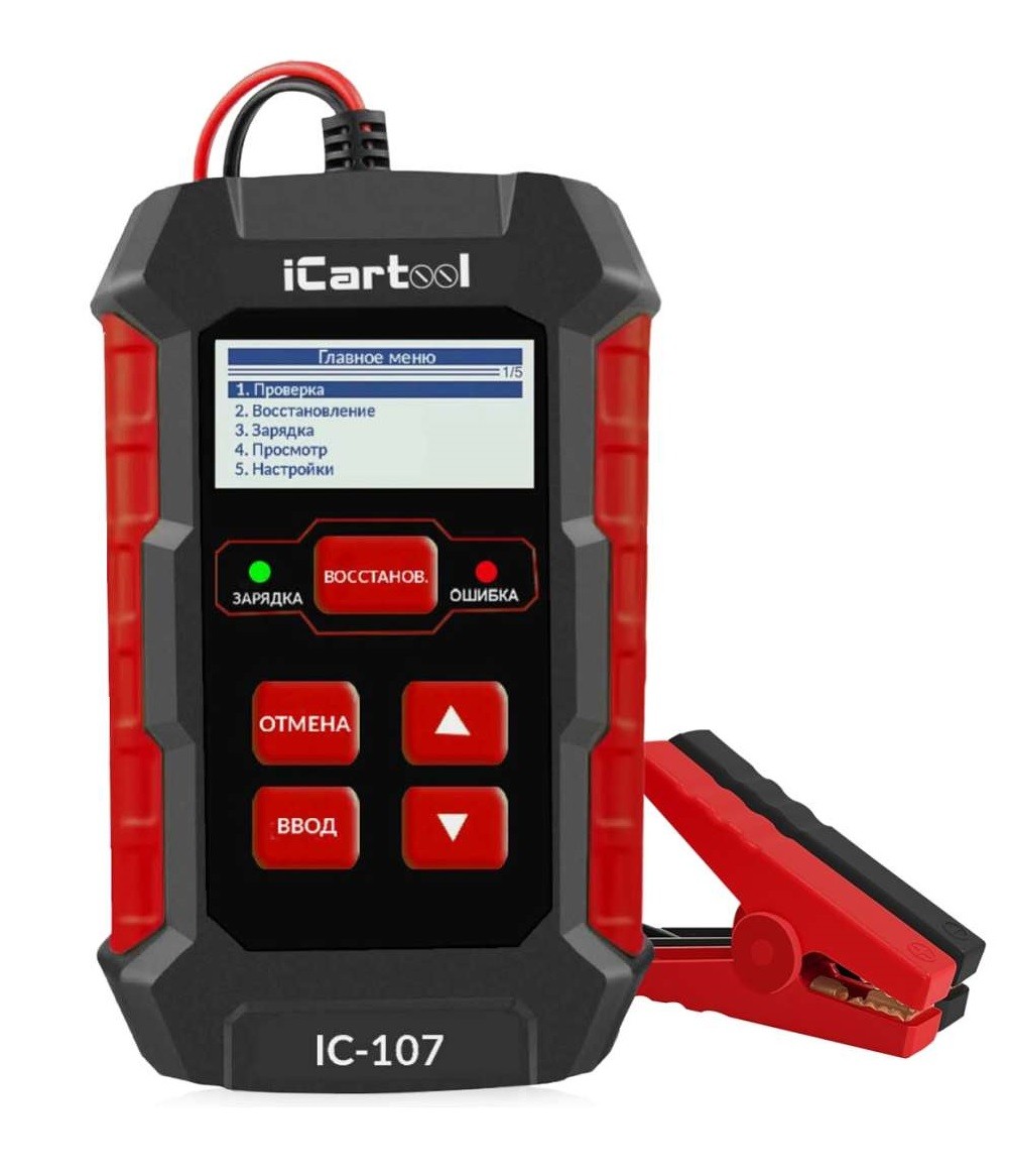 iCarTool IC-107 Тестер аккумуляторных батарей предназначен для проверки уровня заряда и общего состояние аккумулятора, тестирования системы заряда и пуска двигателя, зарядки аккумулятора, восстановление аккумулятора (устранить сульфатацию пластин).