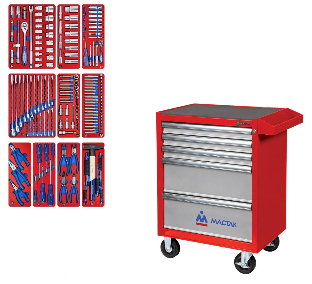Инструментальная тележка с пятью ящиками, с набором инструмента торговой марки МАСТАК - состоит из 192-х предметов, и включает в себя 10 ложементов. Предназначена для организации рабочего места в любом производственном помещении, станции технического обслуживания или авторемонтной мастерской.