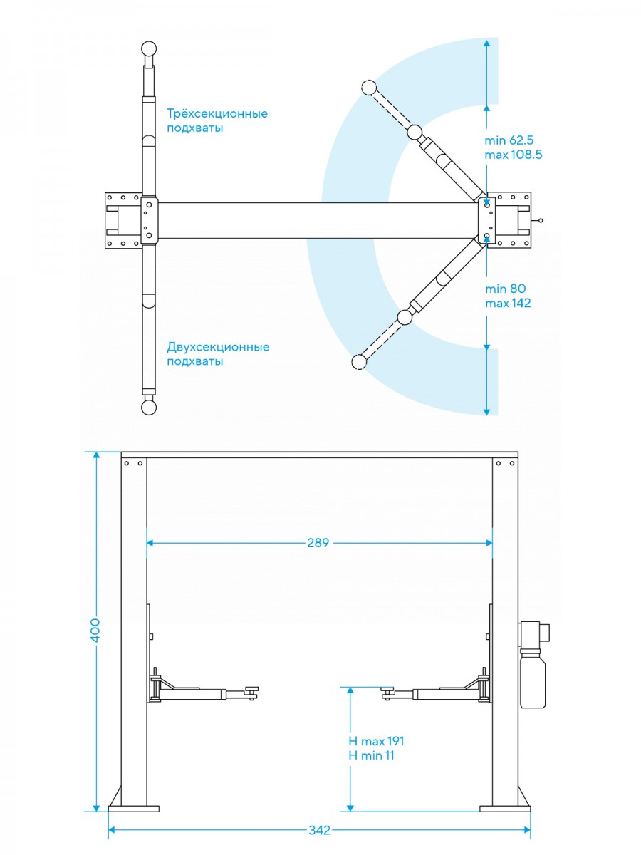 Подъемник 2-х стоечный, электрогидравлический г/п 4,0 т, симметричной конструкции с верхней синхронизацией. Ручное снятие со стопоров на каждой колонне, два гидроцилиндра.